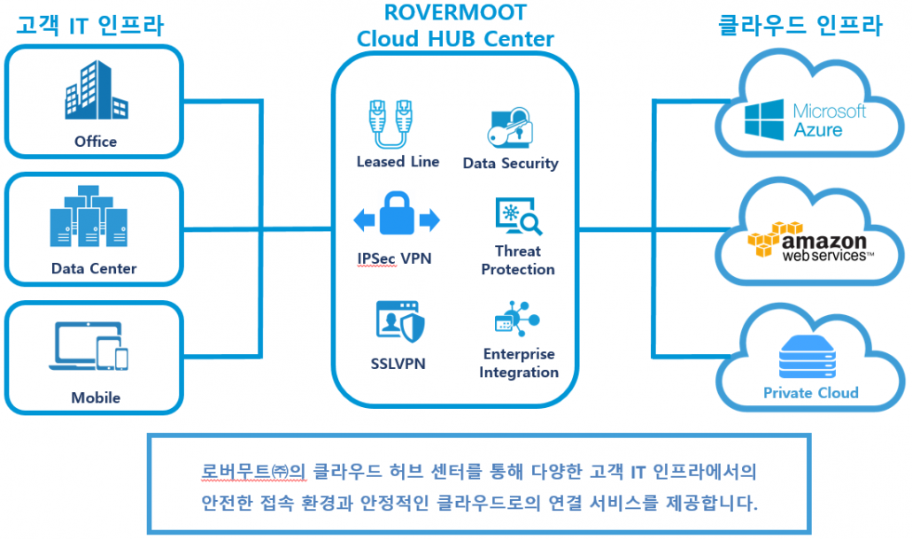 로버무트㈜의 클라우드 허브 서비스(Cloud HUB Service)는 사무실, 데이터센터 등의 고객 인프라 환경에서 Amazon AWS 또는 Microsoft Azure 등의 클라우드 서비스로의 안전한 연결을 제공하고 전용선, VPN 등 다양한 접속 방식의 클라우드 연결 서비스를 제공합니다.