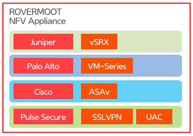 NFV Appliance의 활용은 기존의 물리적인 Firewall 및 L4 Switch, SSLVPN (Juniper SRX, Cisco ASA, PulseSecure SSLVPN, Fortinet, Sonicwall 등) 외에도 다양한 솔루션들을 통합하고 동시에 여러 벤더의 솔루션들을 한 개의 Appliance에서 운영하실 수 있습니다.