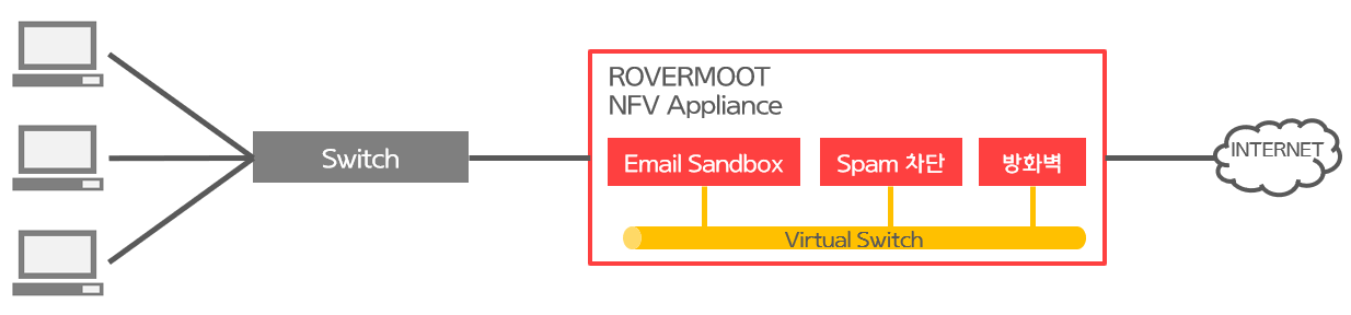 - NFV에 방화벽 외에 Virus 및 Ransomware의 감염경로인 Email 첨부파일 검사 등의 네트워크 보안 기능을 통합 구성.