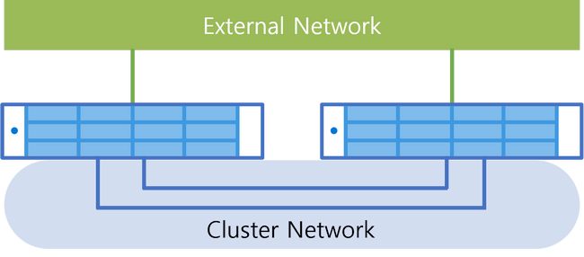 2-Node HCI Appliance without Active Directory는 클러스터 구성을 위한 스위치 없이 구축되며, 인터넷 또는 기존 업무망에 연결하고 IP 구성 등의 최소 설정 만으로 HCI 인프라 구축이 완료됩니다.
