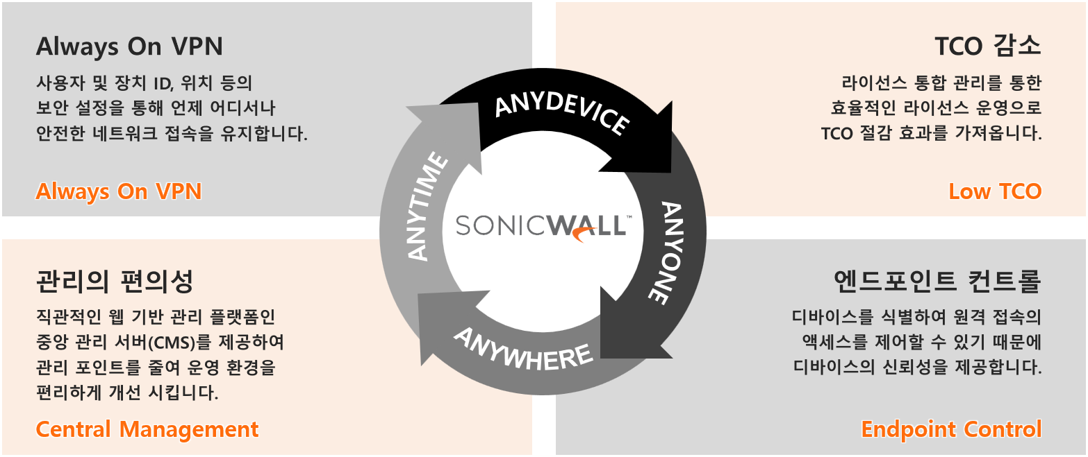SonicWall SSL VPN은 사용자에게 언제 어디서나 중요한 데이터에 액세스 할 수 있도록 안정적인 원격 액세스를 제공하며, 사용하기 쉽고 관리하기 쉬운 VPN 솔루션입니다. 원격 클라이언트와 호스트 보안 액세스를 위해 SonicWall은 SSL VPN 및 IPSec VPN 연결 옵션을 모두 제공합니다. |