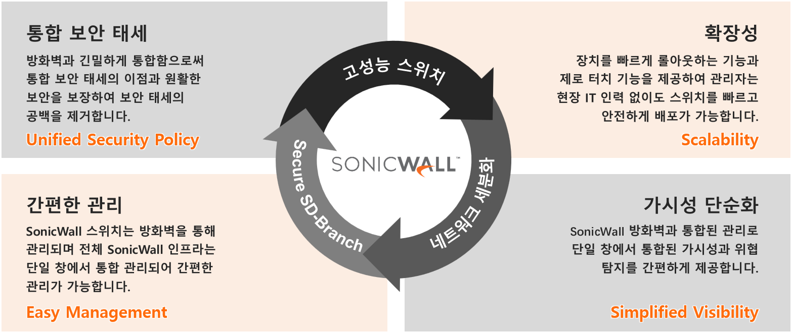 SonicWall 스위치는 고속 스위칭을 제공하여 비즈니스에 필요한 안전한 고속 연결을 일관되게 제공할 수 있으며, 더 많은 장치를 추가하고 SaaS 확산을 유지하며 네트워크 및 예산을 보호합니다. 또한 통합 보안 태세를 통해 중소기업 및 Software Defined Branch (SD-Branch) 구축에 이상적인 스위치로 변화하는 네트워크 및 보안 환경에 대응할 수 있습니다.