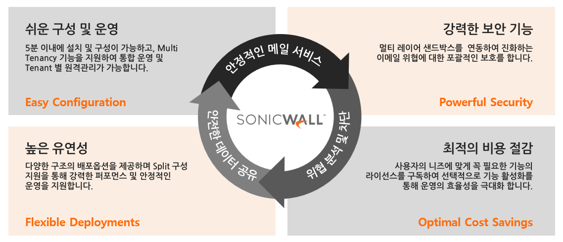 | 이메일에는 중요한 정보가 포함 되어있고, 조직의 모든 사람이 쉽고 빠르게 다양한 장치와 통신할 수 있도록 하기때문에 랜섬웨어, 피싱, 기업 이메일 침해(BEC), 스푸핑, 스팸 및 바이러스와 같은 위협에 쉽게 노출될 수 있습니다. Sonicwall Email Security는 멀티 레이어 On-Premise 솔루션으로 안정적인 메일 서비스를 제공하며, 쉬운 구성과 샌드박스 기능을 통해 강력하고 효과적으로
