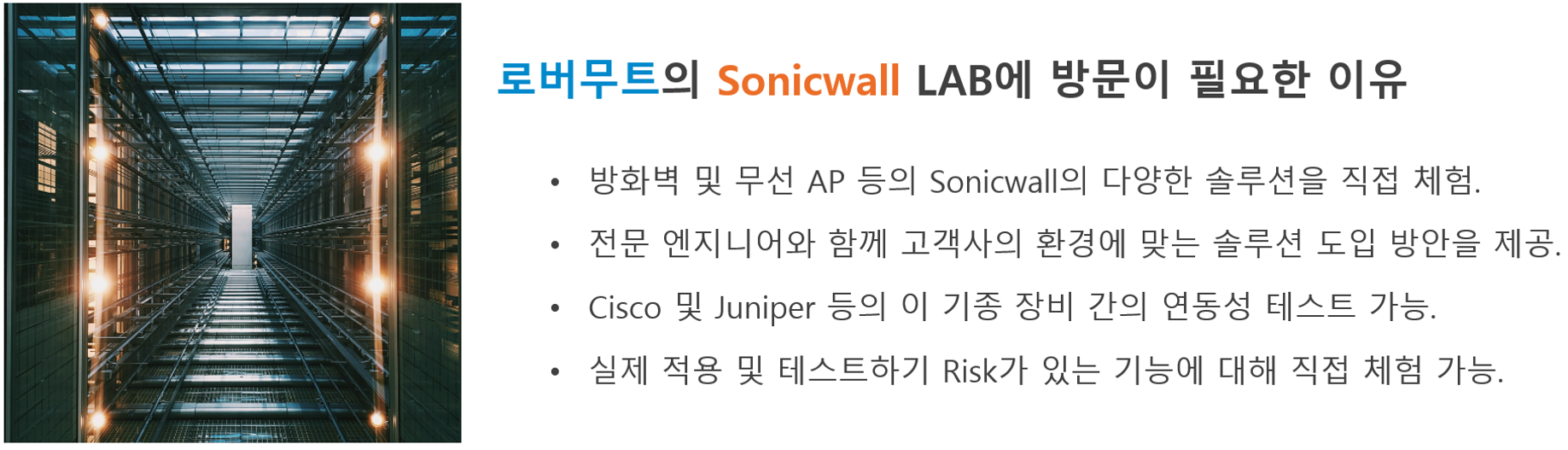 차세대 방화벽 Capture ATP(Sandbox) 및 Anti-Virus, Web Filtering, Application Control 등의 다양한 보안 기능 체험. Sonicwall과 Juniper 등의 이 기존 방화벽 간의 VPN Tunnel 호환성 체크. 트래픽 복호화 기술을 통해 암호화 트래픽 내 악성파일을 탐지 및 차단하는 기능을 체험. 운영 중인 환경에서 Risk가 있는 설정은 체험 센터에서 적용 테스트 후에 실제 환경에 적용 가능. SSL VPN SSLVPN의 기본 기능과 단말기의 상태를 확인하여 내부 네트워크로의 접속을 허용 또는 차단하는 End Point Control 기능을 체험. SSLVPN 접속 시에 Tunnel 모드에 따른 동작 방식 및 보안 정책 방향을 체험. 무선 Access Point Wifi 6를 지원하는 소닉월 최신 무선 제품을 체험. Cloud 기반의 Wireless Network Management를 통해 Wifi 6 환경 구현 및 운영 체험. 기존 방화벽에서 지원하던 Capture ATP(Sandbox) 및 Anti-Virus 등의 보안 기능을 적용한 무선 네트워크 환경을 체험. Email Security Email에 포함된 첨부파일 및 링크를 분석하여 탐지 및 방어하는 기술 체험. Email의 첨부파일이 Capture ATP(Sandbox) 기술을 통한 스캔 동작 체험. SonicWall과 관련된 다양한 콘텐츠를 확인해 보세요.
