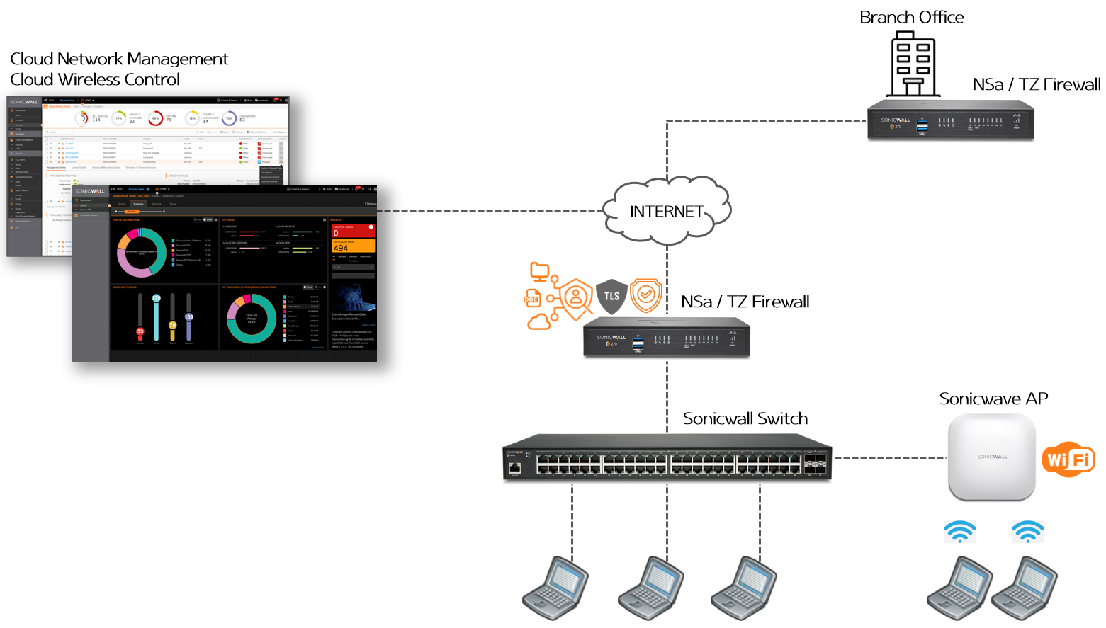 차세대 방화벽 Capture ATP(Sandbox) 및 Anti-Virus, Web Filtering, Application Control 등의 다양한 보안 기능 제공. 트래픽 복호화 기술을 통해 암호화 트래픽 내 악성파일을 탐지 및 차단하는 기능 제공. 스위치 L2 스위치로 1G 및 10G를 지원하는 고속 네트워크 스위칭을 제공. 무선 Access Point Wifi 6를 지원하는 소닉월 최신 무선 제품 제공. Cloud 기반의 컨트롤러를 통해 정책 설정, 인증 및 로밍 등의 구성 지원. Cloud Network Security Manager & Wireless Network Manager Cloud 기반의 통합 관리 서비스. SaaS를 통해 제공되는 방화벽 및 스위치, 무선AP를 통합 관리하고, 네트워크에 대한 가시성을 제공. 무선 AP의 Cloud 기반 컨트롤러 역할 수행. SonicWall과 관련된 다양한 콘텐츠를 확인해 보세요.